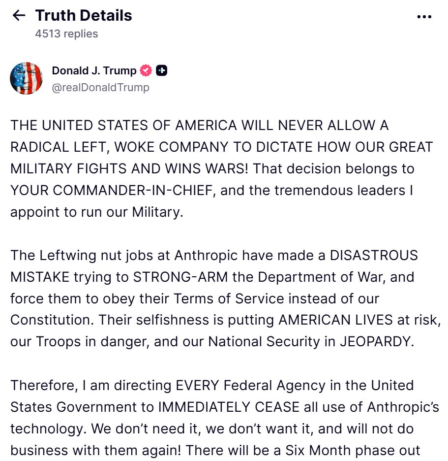 Pete Hegseth and Donald Trump want AI tech handed over to them, carte blanche, to use as they please, no questions asked. The Administration refuses to agree that it won’t use AI to spy on us. That’s what Anthropic is safeguarding, rightfully refusing to budge on the issue of domestic surveillance.